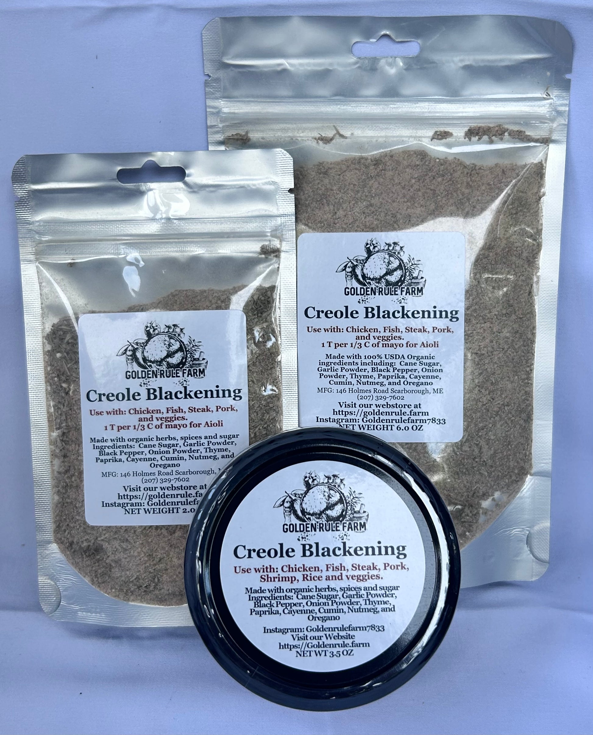 Creole Blackening is for fish, shrimp, steak, pork, chicken, tomatoes, and okra. Add a great kick of heat and flavor with cane sugar and cayenne for some heat. This is a salt free product.